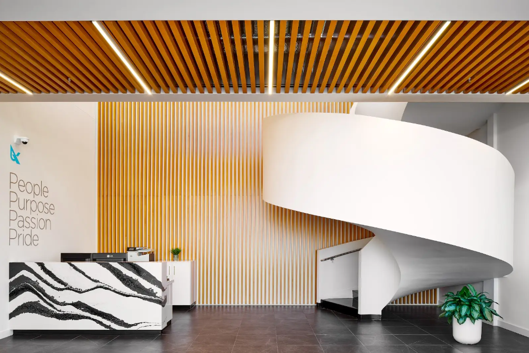 High Design Expectations: The distinctive façade fins and curved staircase demanded exceptional craftsmanship to meet the client’s vision for a visually striking, one-of-a-kind facility.
